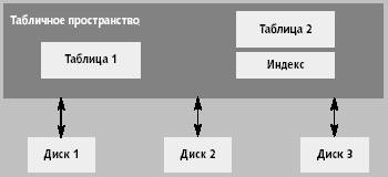 Общим для СУБД Oracle, DB2 и Informix является понятие пространства (для Oracle и DB2 это табличное пространство). Различные логические структуры данных, такие как таблицы и индексы, временные таблицы и словарь данных размещены в табличных пространствах. В DB2 и Informix дополнительно можно устанавливать размер страницы отдельно для каждой из этих структур. Группировка хранимых данных по пространствам производится по ряду признаков: частота изменения данных, характер работы с данными (преимущественно чтение или запись и т.п.), скорость роста объема данных, важность и т.п. Таким образом, например, только читаемые таблицы помещаются в одно пространство, для которого установлены одни параметры хранения, таблицы транзакций размещаются в пространстве с другими параметрами и т.д. (рис. 3).