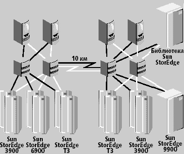 StorEdge Availability Suite — специализированное программное обеспечение для автоматизации управления консолидированным хранением данных в случаях, связанных с возможной потерей целостности инфраструктуры хранения. Система использует в качестве базовой политики механизм point-in-time копии данных и службу «удаленного зеркалирования» (remote mirror). Применение этих технологий для массивов SAN, построенных с применением RAID, позволяет снизить вероятность полной потери данных, что особенно важно для практического применения идеологии SAN в крупных информационных системах. Технология point-in-time позволяет регулярно получать полный моментальный «снимок» (snapshot) текущей структуры и актуального содержимого консолидированного банка данных сети хранения. Применение StorEdge Availability Suite позволяет выполнять копирование структуры и содержимого без прерывания обслуживания актуализированных процессов сетью хранения.StorEdge Availability Suite в режиме реального времени выполняет получение копий point-in-time и производит репликацию данных между физически разнесенными серверами консолидированных систем хранения (рис. 3). Объемы данных и расстояния между физическими серверами могут достигать значений в сотни терабайт и десятки тысяч километров, что позволяет вплотную приблизиться к абсолютному решению задач класса disaster recovery.