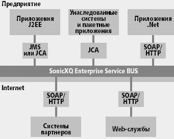 Enterprise Service Bus, построенная на основе SonicXQ является одним из них. С помощью формируемой SonicXQ корпоративной магистрали реализуется распределенная архитектура, ориентированная на службы. ESB позволяет создавать контейнеры для размещения служб. Службы легко собрать и согласовать, поскольку упакованная в контейнер и являющаяся частью ESB служба представима другим частям ESB. При этом вся конструкция является виртуальной; реальная физическая сеть, в которой она «живет», может подвергаться изменениям без потери функциональности.