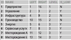 | Таблица 2. Представление иерархий с помощью левой и правой границ |