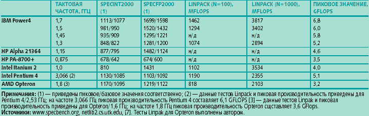 Примечания: (1) — приведены пиковое/базовое значения соответственно; (2) — данные тестов Linpack и пиковая производительность приведены для Pentium 4/2,53 ГГц; на частоте 3,066 ГГц пиковая производительность Pentium 4 составляет 6,1 GFLOPS [3] — данные тестов Linpak и пиковая производительность приведены для Opteron/1,6 ГГц; на частоте 1,8 ГГц пиковая производительность Opteron сщставляет 3,6 GFlops. Источники: www.specbench.org, netlib2.cs.utk.edu , [7]. Тесты Linpak для Opteron выполнены автором. |