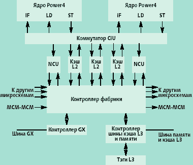 Через специальное устройство — «контроллер фабрики» (FC — fabric controller) — данные могут быть направлены в кэш третьего уровня и оперативную память. Через контроллер шины GX, имеющий порт к FC, осуществляется весь ввод-вывод. Кэш третьего уровня реализован как отдельная микросхема, являясь внешним по отношению к процессорам. Кэш третьего уровня является общим для модуля MCM, конструкция которого может содержать, кроме микросхемы кэша третьего уровня, четыре микросхемы Power4. Для передачи данных между микросхемами Power4, входящими в МСМ, и между самими модулями МСМ, в FC предусмотрены выделенные порты. Детали строения кэша третьего уровня и МСМ, как сказано выше, мы предполагаем рассмотреть в статье, посвященной компьютерам на базе Power4.