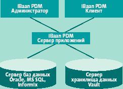 iBaanPDM имеет трехуровневую архитектуру (рис. 2): сервер баз данных и сервер хранилища данных (Vault); PDM-сервер (IIS, MTS); PDM-клиенты (CFE).