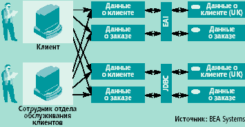 | Рис. 1. Традиционно пользователь (например, сотрудник отдела обслуживания клиентов), желающий получить информацию из нескольких источников, может опрашивать источники лишь в порядке очереди, а это связано с более значительными затратами времени и средств, чем в случае одновременного доступа к множеству источников. В данном случае доступ пользователей к отдельным базам данных осуществляется с помощью программных средств интеграции приложений предприятия (enterprise application integration, EAI) и JDBC. |