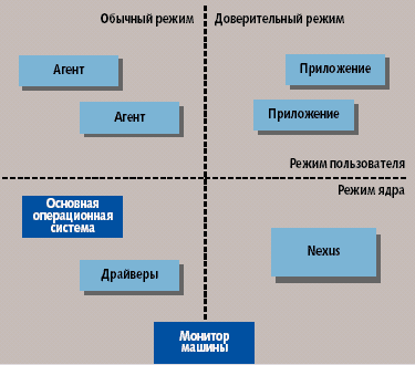 На рис. 2 представлена конфигурация NGSCB, построенная на базе специальной высоконадежной операционной системы. В левой части рисунка показаны программные средства, выполняемые на современных компьютерах массовой архитектуры — операционная система, драйверы устройств и приложения. В правой части рисунка представлено компактное ядро высоконадежной ОС (nexus), а также выполняемые на нем приложения и агенты. Обе системы сосуществуют в пространстве одного компьютера. Монитор машины изолирует системы, чтобы ни одна из них не могла влиять на работу другой.