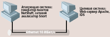 Тестирование реализации стеков операционной системы и IDS проводилось на макете, состоящем из двух компьютеров, объединенных сетью Ethernet. Хост, с которого проводилось тестирование, назывался «атакующей системой», а тестируемый хост — «целевой системой» (рис. 3). На хосте имелся файл с названием PHF. Доступ к данному файлу моделировал доступ к уязвимому сценарию phf (www.infosecurity.com/archive/1). В случае HTTP-запроса с атакующей системы к этому файлу Web-сервер передавал его содержимое атакующему, что говорило об успехе атаки. Совсем необязательно выполнять сам сценарий на Web-сервере: если Web-сервер выдал содержимое файла, можно считать, что атака состоялась. Атакующий мог видеть результат атаки на экране с помощью запущенного сетевого анализатора Snort. В случае успеха Snort перехватывал содержимое файла PHF. Обращение к файлу PHF выбрано не случайно. Во-первых, в [1] рассматривали также обращение к PHF. Во-вторых, данная уязвимость была обнаружена в 1996 году и все рассмотренные IDS имели правила для поиска такой сигнатуры.