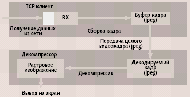 Избежать простоя процесса декомпрессии можно следующим образом. Так как используется протокол TCP/IP, то время окончания приема кадра клиентом примерно совпадает с моментом окончания передачи этого кадра на сервере, следовательно, можно избежать ожидания сервером нового запроса. При этом по событию окончания передачи предыдущего кадра сервер должен начать передачу нового. В этом случае клиент уже не посылает запрос на получение кадра, а вместо этого единожды «подписывается» на получение потока кадров. Чтобы пояснить, как происходит регуляция скорости в этом случае, рассмотрим одну из особенностей работы протокола TCP/IP (рис. 2).