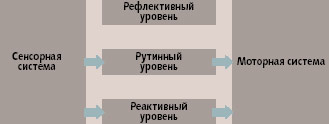 Средний уровень — рутинный. У людей на этом уровне формируются действия на базе навыков. Это, если можно так выразиться, хорошо заученные и в значительной степени сведенные к «рутине» поведенческие акции. К ним относятся почти все моторные навыки, включая владение речью. Поведение человека на рутинном уровне представляет собой очень сложную систему. Для выбора линии поведения и управления ею субъект обрабатывает значительные объемы данных. Рутинный механизм должен иметь доступ и к рабочей, и к более долговременной памяти, а также к механизмам оценки и планирования. Исходные для рутинного уровня данные поступают от сенсорных систем, снизу — с реактивного уровня — и сверху — с рефлективного уровня в форме сигналов управления (подавление и активация). В свою очередь, рутинный уровень может как подавлять, так и активировать ответы реактивного уровня, а при выявлении отклонений от нормы или от стандартных ожиданий этот уровень может направлять аффективную информацию наверх — на рефлективный уровень.