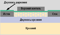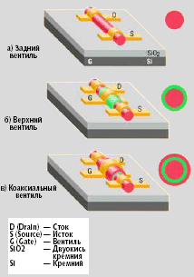 Кремниевые нанопроволоки изготовляются в нескольких геометриях. На рис. 4 показаны три варианта устройств, в которых кремниевые нанопроволоки соединяют контактные точки истока и стока, но вентильные структуры во всех случаях различны. В настоящее время проводятся эксперименты с целью измерения электрических характеристик коаксиальных структур с толщиной окиси, составляющей несколько нанометров; предполагается, что характеристики данных структур будут гораздо ближе к теоретическому пределу.