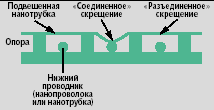 | Рис. 5. Коммутируемое соединение с подвешенной нанотрубкой. Одна матрица нанопроволок накладывается на вторую, ориентированную под прямым углом к первой. В зависимости от деталей устройства точки пересечения матриц могут использоваться либо для хранения, либо для коммутации информации |
