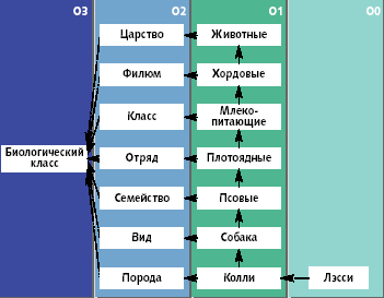 Однако исследователи давно уже признают полезной способность свободного построения моделей с помощью метаконцепций (т.е. полного использования потенциала уровня O2). Возможность использовать такие метаконцепции, как «Порода Дерева» [7] или «порода» дает большие преимущества. На рис. 5 представлены, возможно, самые зрелые и установившиеся примеры онтологического метамоделирования: биологическая систематика живых существ. Метаконцепции, такие, как «порода», «вид» и т.д. позволяют добавлять к систематике новые классы существ. В программной системе они облегчили бы динамическое добавление новых типов на этапе исполнения. Обратите внимание, что на уровне O1 нельзя использовать концепции «порода», «вид» и т.д. в качестве супертипов. Ведь при том, что утверждения «Лэсси — это колли», «Лэсси — это собака» имеют смысл, заявления о том, что Лэсси есть порода или вид, и т.д., явно бессмысленны. К тому же, размещение уровня O3 (см. рис. 5) в онтологическом метаизмерении не составляет проблемы, а стереотипы не предназначены для решения этой задачи.