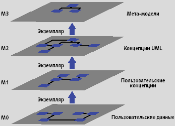 При подобном подходе к онтологическим отношениям «A есть экземпляр B», которые соотносят пользовательские концепции с их доменными типами, отводится второстепенная роль. Иными словами, если лингвистические отношения «A есть экземпляр B» пересекают лингвистические метауровни (и формируют основу для последних), то онтологические отношения «A есть экземпляр B» не пересекают этих уровней; они соотносят объекты внутри данного уровня. На рис. 2 представлена эта последняя интерпретация четырехуровневой архитектуры, реализованная в новых стандартах UML 2.0 и MOF 2.0. В последнем представлен по преимуществу лингвистический взгляд на вещи, тем не менее полезно допустить такую ситуацию, при которой онтологическое (внутриуровневое) порождение экземпляра обретает свои собственные онтологические (вертикальные) метауровневые границы.