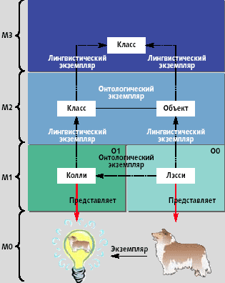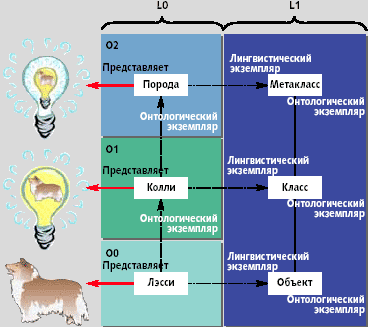 В стандартах UML 2.0 и MOF 2.0 лингвистическому измерению придается первоочередное значение. Уровни O0 и O1 присутствуют на уровне M1, но нет метауровневой границы, явно отделяющей эти уровни друг от друга. Как таковое онтологическое метамоделирование не исключается, но механизмы его реализации — профили и стереотипы — имеют известные ограничения. Возможность выразить отношение между объектами «колли» и «порода» (первый является экземпляром второго) существует (рис. 4), но при стереотипном моделировании уже нет возможности пользоваться полным арсеналом концепций моделирования M1 — к примеру, визуальная модель ассоциаций и отношений обобщения между метаконцепциями.