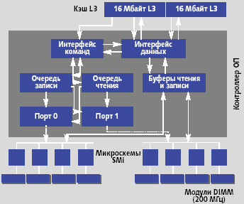 Каждая микросхема POWER4 может иметь выделенный контроллер оперативной памяти, подсоединяемый «за» кэшем третьего уровня. Этот контроллер, поддерживающий две из четырех процессорных микросхемы модуля МСМ, может обладать одним или двумя портами в памяти. Контроллер оперативной памяти подсоединяется к микросхемам eDRAM, которые имеют по две 8-байтные шины данных — по одной в каждом направлении (рис. 1). Эти шины работают на частоте, втрое меньшей частоты процессора. Каждый порт данных контроллера оперативной памяти объединяет четыре двунаправленные 400-мегагерцевые шины шириной 4 байта, которые связывают буферы загрузки/записи этого контроллера с четырьмя микросхемами SMI (System Memory Interface), используемыми для собственно чтения и записи данных в память. Контроллер оперативной памяти содержит три буфера — команд чтения и записи по 64 строки каждый, а также очередь записи емкостью 16 строк.