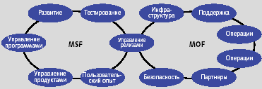 MOF концентрируется на обеспечении требуемого качества эксплуатации информационных систем. Вопросы упорядочения проектной деятельности рассматриваются в документе Microsoft Solutions Framework (MSF), описывающем принципы проектирования, разработки, внедрения и модификации программных и инфраструктурных решений. MSF тесно связан с MOF (рис. 2), и совместное использование этих подходов позволяет построить в организации целостную систему обеспечения всего жизненного цикла применения ИТ для удовлетворения бизнес-потребностей.