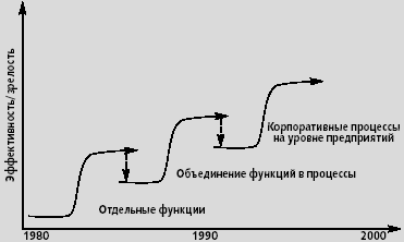 Для того чтобы найти пути к преодолению этой раздробленности, необходимо, прежде всего, оценить происходящее. За последние двадцать лет автоматизация бизнеса и соответственно ИТ прошли три основных этапа, на каждом из них степень интеграции повышалась, первый — автоматизация отдельных функций, второй — автоматизация процессов, третий — автоматизация предприятия в целом. Для иллюстрации этой динамики иногда используют так называемые S-кривые (рис. 2), где каждая из «S» отражает развитие на этапе, а все вместе — глобальную тенденцию. Средства управления ИТ с неизбежностью должны развиваться, повторяя в точности эти траектории (рис. 3). В конечном счете, основные составляющие управления ИТ должны слиться в единую корпоративную систему управления ИТ-средствами (IT Enterprise Management).