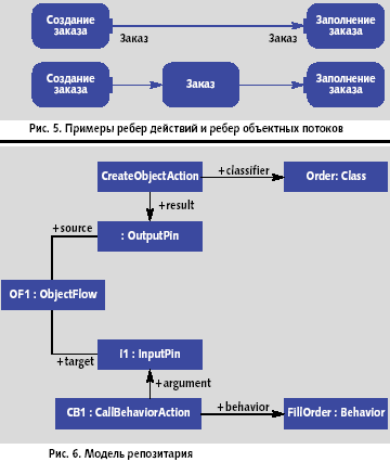 Примитивные действия по созданию объектов, по вызову определяемых пользователями работ и т.д. сами по себе не являются работами с точки зрения техники, но это не концептуальное различие, а скорее артефакт метамоделирования. Фундаментальным является различие между спецификацией динамического эффекта и его использованием: возможны различные использования одной и той же спецификации. Например, одна и та же работа FILLORDER может вызываться во многих диаграммах деятельности или вызываться много раз в одной и той же диаграмме деятельности, но в репозитарии каждый вызов будет представлен отдельным экземпляром действия CALLBEHAVIORACTION, и все эти экземпляры будут ссылаться на одну и ту же работу FILLORDER. Дело в том, что каждое использование FILLORDER будет происходить в отдельном потоке или в разных точках одного и того же потока, и при каждом использовании эта работа может предваряться и завершаться разными действиями. К примеру, на рис. 6 FILLORDER предваряется действием CREATEOBJECTACTION, а в другом потоке это действие может отсутствовать7.