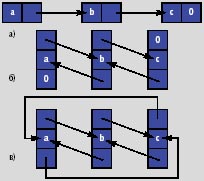 | Рис. 1. a) односвязный список, б) двусвязный список, в) циклический двусвязный список |