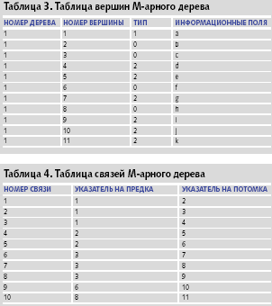 Существует более сложный способ представления M-арного дерева, требующий для хранения дерева две таблицы: вершин и связей. Таблица вершин состоит из четырех полей.