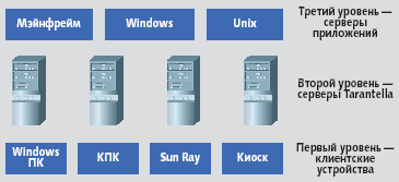 Современная версия этого программного продукта, Tarantella Enterprise 3, обеспечивает быстрый доступ к приложениям, расположенным практически на любом сервере, с рабочего места, которое может иметь любое географическое расположение. Все, что для этого требуется на клиенте, — это наличие браузера и сетевого подключения. Доступ контролируется и персонализируется в соответствии со служебным положением, рабочими функциями и местонахождением пользователя. В архитектуре Tarantella Enterprise 3 клиент и приложение взаимодействуют только с «брокером» в виде серверов Tarantella и никогда — между собой. Таким образом, данное решение реализует примерно те же преимущества, которые получают при использовании широко обсуждавшейся трехзвенной модели приложений, в которой роль брокеров играют серверы приложений.