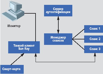 В решении Sun Ray, предложенном Sun Microsystems, идея тонкого клиента доведена до логического предела (рис. 6). Устройство не имеет собственного состояния (как, например, сотовый телефон без SIM-карты). В данном случае роль SIM-карты играет более интеллектуальная смарт-карта, которая содержит сверхминиатюрный компьютер с оперативной памятью и перепрограммируемой постоянной памятью (electrically erasable programmable read-only memory, EEPROM). Ее вычислительная мощность сопоставима с мощностью PC XT, первого персонального компьютера IBM. Столь мощный ресурс позволяет хранить на смарт-карте все необходимые данные о клиенте и сеансах его работы, что, в свою очередь, дает возможность перемещаться с одного устройства на другое без потери данных (вплоть до сохранения состояния экрана). При использовании других аппаратных платформ тонких клиентов добиться этого нереально.