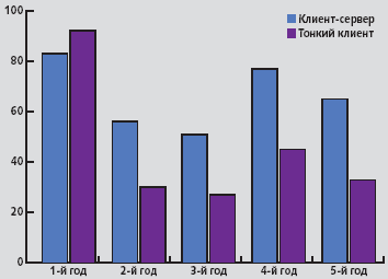 Одной из основных причин, по которым группа «Альфастрахование» отдала предпочтение технологиям терминального доступа, является экономическая эффективность полномасштабного внедрения MetaFrame XP. Она достигается, в частности, за счет уменьшения затрат на администрирование и обновление компьютерного парка компании. По расчетам Citrix, при внедрении технологий на базе «тонкого» клиента в крупных компаниях, подобных «Альфастрахованию», экономия может достигать до 50% средств на поддержание информационной инфраструктуры в работоспособном состоянии — по сравнению с затратами при использовании традиционной клиент-серверной архитектуры (рис. 3). Для группы «Альфастрахование» снижение затрат на владение информационной системой удаленного представительства составила, по предварительным оценкам BCC, от 30% до 75%.