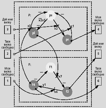В используемом нами решении отдельный философ представлен двумя параллельными моделями — «вилкой» и «слугой» [6, 7]. Модели представлены на рис. 2 автоматами P и F. Эти автоматы, взаимодействуя между собой, реализуют поведение отдельного философа, а философы, общаясь между собой, - общее поведение системы, решая, как в нашем случае, задачу сортировки данных. Связи автоматов на графе изображены пунктирными стрелками. Аналогичными стрелками показаны связи философа с его соседями. Автоматы и связи в сумме составляют модель философа в форме СМКА (сетевая машина конечного автомата) [8].