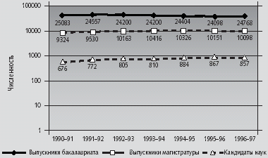 Уровень выпуска трехзвенной системы ИТ-образования в США в течение последних лет, по данным официальной статистики, оставался практически неизменным (см. рис. 1, 2). «Пирамида» численности основных профессиональных групп на рынке труда представлена на рис. 3. За единицу отсчета принята численность исследователей (специалистов высшей квалификации).