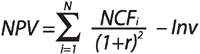где NCFi — чистый денежный поток для i-го периода, Inv — начальные инвестиции, r — ставка дисконтирования (стоимость капитала, привлеченного для инвестиционного проекта).