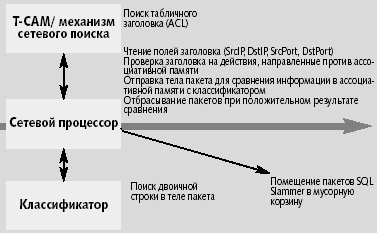 На рис.4 показано, как современная архитектура справляется с атаками типа SQL Slammer. Деструктивные пакеты выявляются и отбрасываются, а легитимные пакеты той же службы не затрагиваются. В данном случае сетевой процессор выбирает поля заголовков, необходимые для идентификации типа пакета. Он посылает ключевые поля заголовка (в частности, IP-адрес и номер порта UDP) сетевому поисковому механизму, который выполняет проверку и отбирает пакеты, требующие дополнительного анализа. Чтобы определить, содержит ли пакет UDP, обращающийся к порту 1434 код червя SQL Slammer, сопроцессор классификации сравнивает его тело с соответствующими шаблонами или сигнатурами. Если результаты этих операций вызывают сомнения в благонадежности пакета, сетевой процессор может отправить его в мусорную корзину или провести альтернативную проверку.