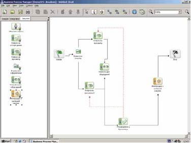 На рис. 2 показано, как проектируют бизнес-процесс в Business Process Manager. Сначала выбирают необходимые шаблоны работ из палитры, расположенной в правой части экрана, а затем компонуют их в маршрут, после чего конфигурируют каждую работу процесса с помощью простого в использовании визуального интерфейса или мастера. Помимо шаблонов работ предусмотрены шаблоны стандартных бизнес-процессов, из которых можно визуальными средствами компоновать сложные процессы, ставя их последовательно или вкладывая друг в друга.