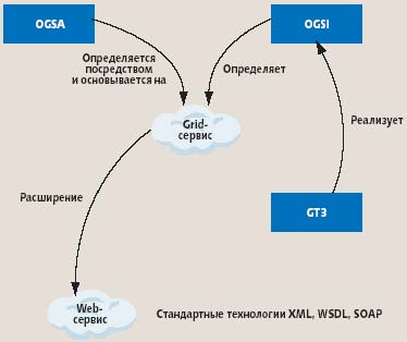 | Рис. 2. OGSA, OGSI, GT3 и grid-сервисы |