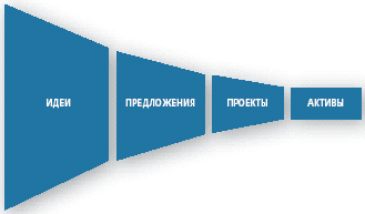 Процедура управления портфелем проектов представляет собой процесс фильтрации (рис. 3). У людей могут возникать тысячи идей о том, как при помощи ИТ сделать работу более эффективной. Все эти идеи необходимо уловить и проанализировать. Допустим, около сотни из них будут признаны достойными вынесения на общее обсуждение в виде предложений, которые пройдут стадии планирования и бюджетирования. И лишь некоторые из предложений будут согласованы, превратятся в проекты, а затем — в активы компании в виде работающих программно-аппаратных комплексов.