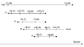 | Рис. 1. Пример работы планировщика MVTO |