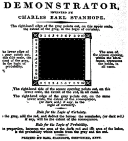 В Англии XIX века были предприняты дальнейшие попытки построить логическую машину. Начало им положил лорд Чарльз Стэнхоуп (1753-1816), известный политический деятель и изобретатель. На его счету — несложные оптические приборы и металлическое перо для письма, но наиболее интересна логическая машина, поучившая название Stanhope Demonstrator, то есть «Демонстратор Стэнхоупа» (рис. 3). В отличие от компьютера Луллия, это была совершенно рациональная конструкция, но и ее судьба оказалась не без странностей: хотя Стэнхоуп построил Демонстратор в самом начале XIX века, первая статья о нем датируется лишь 1879 годом.