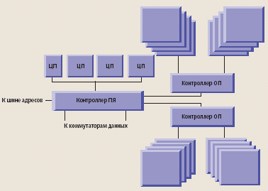 Процессорная ячейка содержит до четырех процессоров Itanium 2, набор микросхем и оперативную память (рис. 2). Набор микросхем был сконструирован таким образом, чтобы обеспечить уменьшение полной стоимости владения за счет поддержания высокого уровня готовности, в частности, путем разбиения сервера на разделы; защиты путей данных кодами ECC (в оперативной памяти используется также технология Chipkill) или битами четности; проверки целостности данных и повторением команд при сбоях [5]. Набор микросхем обеспечивает масштабирование до 32 процессоров (до 8 процессорных ячеек) и до 112 слотов PCI-X (по 14 слотов в каждом из блоков PCI, до 8 блоков на сервер).
