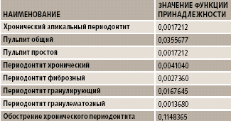 Результаты работы системы приведены в таблице. Исходный список диагнозов содержал 44 элемента, а после обработки системой сократился до 8. Окончательный диагноз выбирался из списка диагнозов с максимальным значением функции принадлежности.