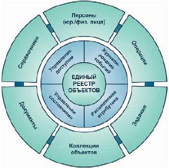 Задачей информационных систем часто является учет субъектов, занимающихся различной деятельностью (юридические и физические лица, банки и т.п.). Для ее решения реализованы типы объектов «Персона», «Отношения персон», которые могут быть типизированы согласно прикладной логике. При этом каждый субъект может быть связан с произвольным числом других субъектов отношением определенного типа (сетевая модель с типизированными связями). Например, менеджер по продажам связан с клиентом отношением договора. Кроме того, существуют дополнительные типы, такие как «Адрес», «Регистрационный документ» (паспорт, свидетельство, лицензия и т.п.), экземпляры которых связываются с объектом «Персона».