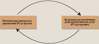 Особенно важна перестройка ITSM-процессов при передаче на аутсорсинг не отдельных задач ИТ-подразделений, а процессов, оказывающих непосредственное влияние на бизнес-процессы. Таким образом, оптимизация ITSM-процессов и использование ИТ-аутсорсинга — это тесно взаимосвязанные процессы. С одной стороны, успех ИТ-аутсорсинга возможен лишь при определенной степени зрелости процессов управления ИТ-услугами, а с другой, ИТ-аутсорсинг является постоянным стимулом к оптимизации ITSM-процессов (см. рисунок). Такое взаимовлияние обеспечивает эффективное управление ИТ на вашем предприятии, определяя оптимальный объем передаваемых на аутсорсинг ИТ-услуг.