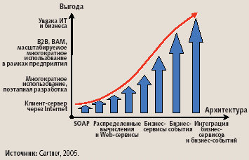 На нижнем крае спектра возможностей использование простого протокола доступа к объектам SOAP позволяет осуществлять обмен данными между клиентскими и серверными системами через Internet. Однако те пользователи, которые считают, что можно получить выгоды от SOA в полном объеме, просто развернув обмен данными на основе SOAP, будут разочарованы. По мере роста инвестиций в архитектуру обеспечиваются различные потенциальные выгоды: