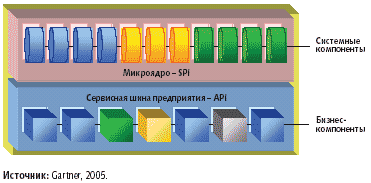 Поставщики платформ все чаще используют архитектурный стиль «микроядра», в котором платформа состоит из ядра и многочисленных подключаемых функциональных компонентов (рис. 10). «Подключаемость» компонентов, уменьшающая сложность управления платформой, достигается с помощью общего набора системных программных интерфейсов (System Programming Interface, SPI). Sun Microsystems совместно с компаниями Tibco, Oracle, SAP и другими стремится возглавить процесс стандартизации подобных интерфейсов, инициировав проект спецификации JSR 208. Некоторые поставщики (например, JBoss) используют расширения Java с целью создания систем управления (Java Management Extensions, JMX). Есть и такие компании, в частности, Iona Technologies, которые применяют специализированные SPI.