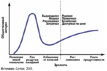 В модели жизненного цикла, предложенной аналитической компанией Gartner (рис. 1), технологии, находящиеся на «плато продуктивности», надежны и вполне понятны, а их стоимость, достоинства и недостатки легко поддаются прогнозированию. Однако выгоды от этих технологий общеизвестны, поэтому их продажи не дают особых конкурентных преимуществ. Напротив, новые технологии, расположенные в области «пика раздутых ожиданий», обычно малопонятны и страдают от недостатка инструментальных средств, некомпетентности и плохого качества реализации. Однако они обещают инновационную дифференциацию, которая для многих предпринимателей является не менее существенной, чем стабильность их основных систем.