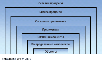 Стратегический прогноз: с 2005 по 2010 годы доля новых прикладных проектов, ориентированных на интегрированную компонуемую модель предприятия, возрастет с 5 до 40% (вероятность 0,7).