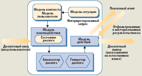 Интерактивный процессор диалога на естественном языке. Процесс начинается с ввода пользовательского запроса, который порождает либо обмен сообщениями на естественном языке, либо направление интерпретированного запроса поисковому агенту
