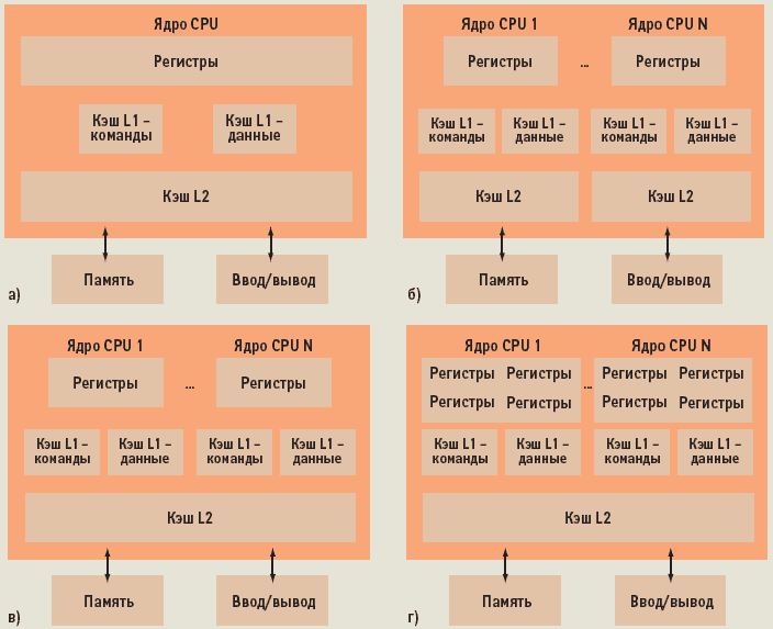 Эволюция CMP: а) традиционный микропроцессор; б) простейшая версия CMP; в) CMP с общей кэш-памятью второго уровня; г) многопотоковая версия CMP