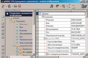 Инструментальная среда qWORD-XML представляет собой универсальный браузер, реализованный на Delphi как клиентское приложение к M-серверу. В универсальном браузере взаимодействие с базой данных осуществляется через экранные формы, описывающие либо все дерево объектов, либо его часть в виде, удобном для конкретного рабочего места. Отображение состоит в общем случае из дерева объектов, дерева экземпляров объектов и панелей инструментов (рис. 4). База данных проектируется визуально как набор взаимоувязанных объектов.