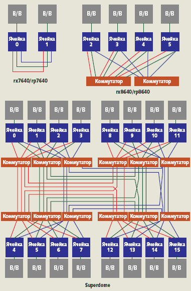 Integrity rx7640 имеют две связанные напрямую ячейки; координатные коммутаторы не используются. В rx8640 четыре ячейки соединены двумя коммутаторами. В старших моделях, Superdome, имеется восемь ячеек и шесть коммутаторов, расположенных в двух стойках.