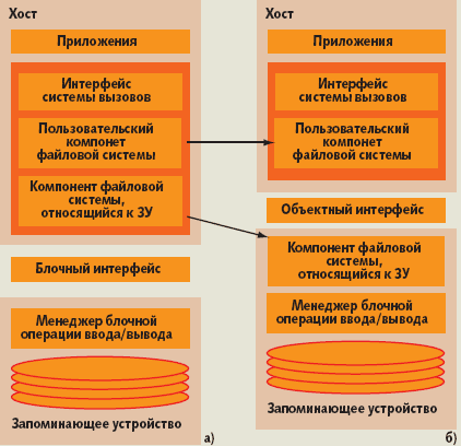 В качестве физического устройства OSD может выступать отдельный диск, дисковый контроллер, а в некоторых случаях — даже лента или оптический диск. Основное отличие OSD от дискового блочного устройства заключено не физике носителя, а в способе организации интерфейса с ним. При использовании обычного блочного устройства любую файловую систему можно условно разделить на два уровня. На системном уровне действуют пользовательский компонент и локальный компонент, управляющий запоминающим устройством; последний переносится непосредственно на устройство (рис. 1а). Пользовательский компонент ответственен за предоставление данных приложениям в форме традиционных логических структур файлов и каталогов, а компонент запоминающего устройства отображает логические структуры в физические блоки. В OSD компонент запоминающего устройства переносится непосредственно на устройство, в таком случае устройство становится более интеллектуальным; обмен с ним становится возможным на уровне объектов (рис. 1б).