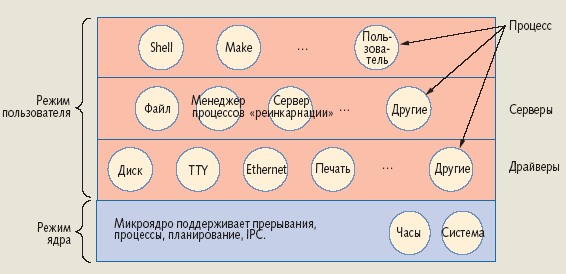Архитектура Minix 3. Микроядро обрабатывает прерывания, предоставляет базовые механизмы управления процессами, реализует взаимодействия между процессами и выполняет планирование процессов