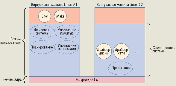 Виртуальные машины. В одной из виртуальных машин Linux выполняются прикладные программы, а драйверы устройств работают в одной или нескольких других машинах